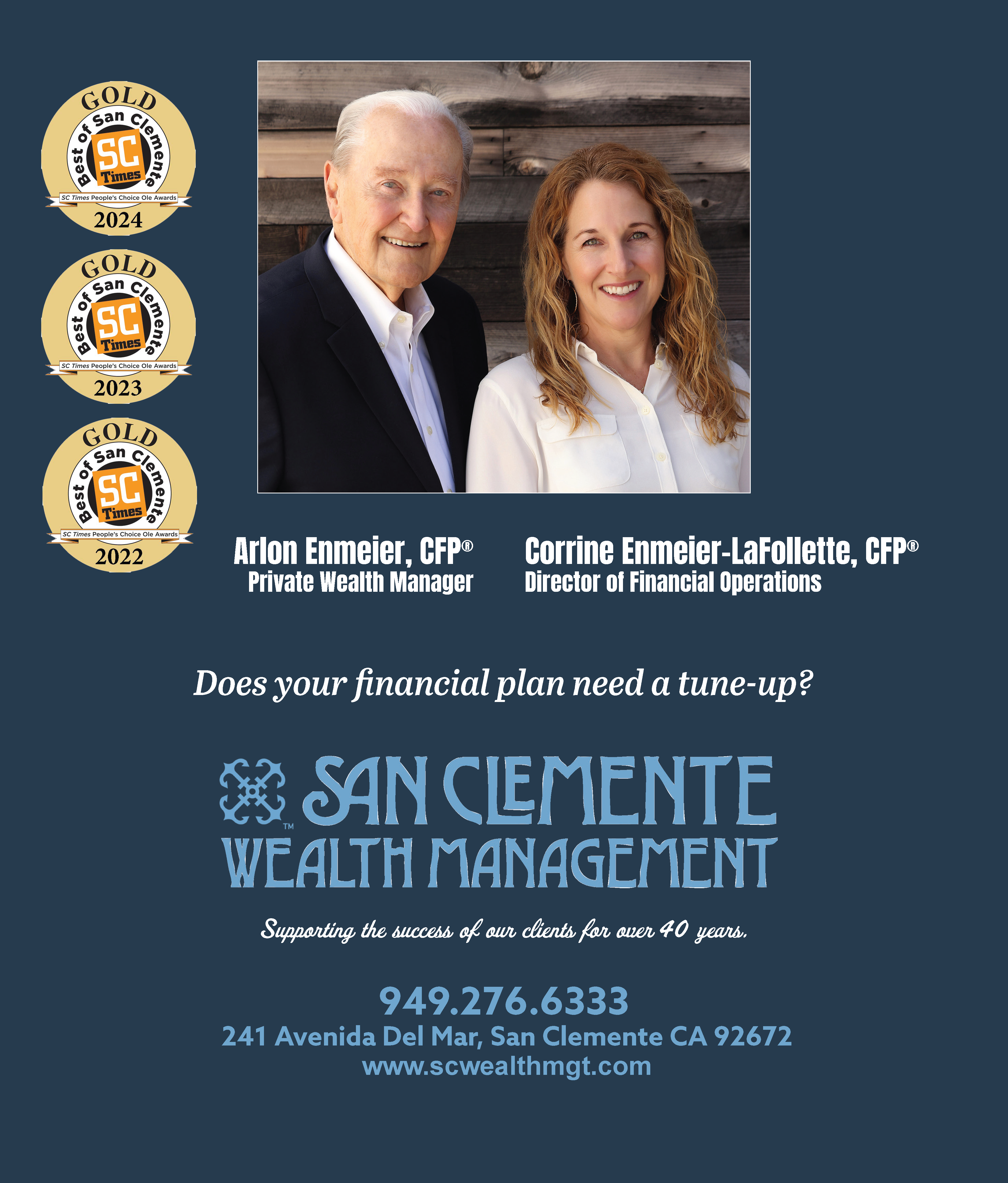 The Best of San Clemente 2022, 23 and 24 are vote-based contests focusing on and highlighting the best businesses, companies, groups, locations, items and services in San Clemente, CA. Nominations are provided by the community and after the nomination period is completed; the names of nominated businesses, people and places in each of the categories are finalized to make up the official The Best of San Clemente 2022, 23 and 24 voting ballots. Nominations and votes are totaled by a third-party. These awards should not be viewed as representative of any one client's experience and should not be taken as an indication of performance by the financial professional, nor of client performance. There is not a fee paid in exchange for these awards.